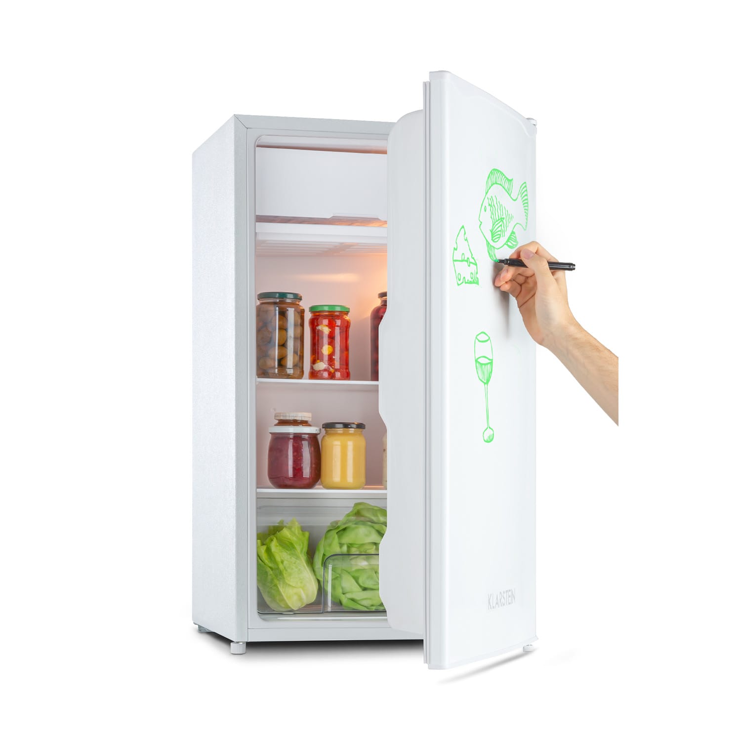 Hideg és kommunikatív: a környezetbarát Klarstein Spitzbergen Uni hűtőszekrény nem csak a friss élelmiszerek tárolására ideális kis háztartásokban, például kollégiumi szobákban, egyszemélyes lakásokban vagy kertes házakban, hanem üzenetküldő funkciója miatt is érdekes a konyhában – legyen szó bevásárlólistáról, meghívókról vagy szerelmes üzenetekről!Kompakt mérete ellenére a Klarstein Spitzbergen Uni hűtőszekrény meglehetősen nagy a tárhely szempontjából. A 91 literes belső terével bőséges helyet biztosít az élelmiszerek széles skálájának a joghurtoktól és sajtoktól kezdve a húsokig és zöldségekig. Különösen praktikus: a 10 literes fagyasztó részben hosszú ideig tárolhat fagyasztott zöldségeket, hasábburgonyát vagy pizzát. Két üvegpolc, egy zöldségrekesz és három oldalsó rekesz az ajtóban biztosítják a friss élelmiszerek tökéletes áttekintését. Az ajtóban a Spitzbergen Uni egy nagy tartóval rendelkezik az italok részére és egy kis rekesszel a tojások, lekvárok, vaj stb. részére. A készülék belsejében található stílusos, energiatakarékos és kristálytiszta LED lámpának köszönhetően mindig tökéletes áttekintése lesz a tárolt élelmiszerekről. A Spitzbergen Uni hűtőszekrény nagyon vonzó és érdekes, különösen a ZestfulART Design elülső ajtójának köszönhetően. A fehér felületre speciális filctollal lehet írni, és a szöveg újra letörölhető. Minden fontos üzenet feljegyzéséhez a megfelelő filctoll a csomagolás része. A konyha teljesen új varázst kap.Az E energiahatékonysági osztálynak köszönhetően a hűtőszekrény rendkívül környezetbarát. A nagyméretű belső szabályozó segítségével a hőmérsékletet öt fokozatban lehet egyénileg beállítani.Egy energiatakarékos készülék minden kis háztartásban hasznos: a Klarstein Spitzbergen Uni hűtőszekrény.